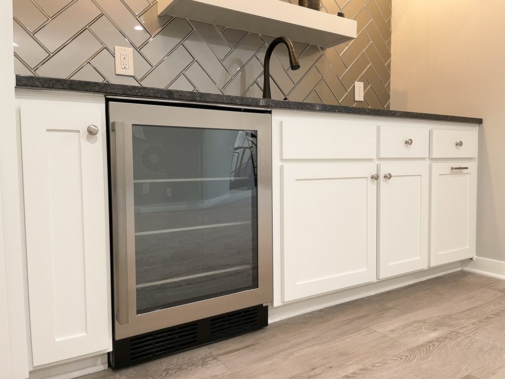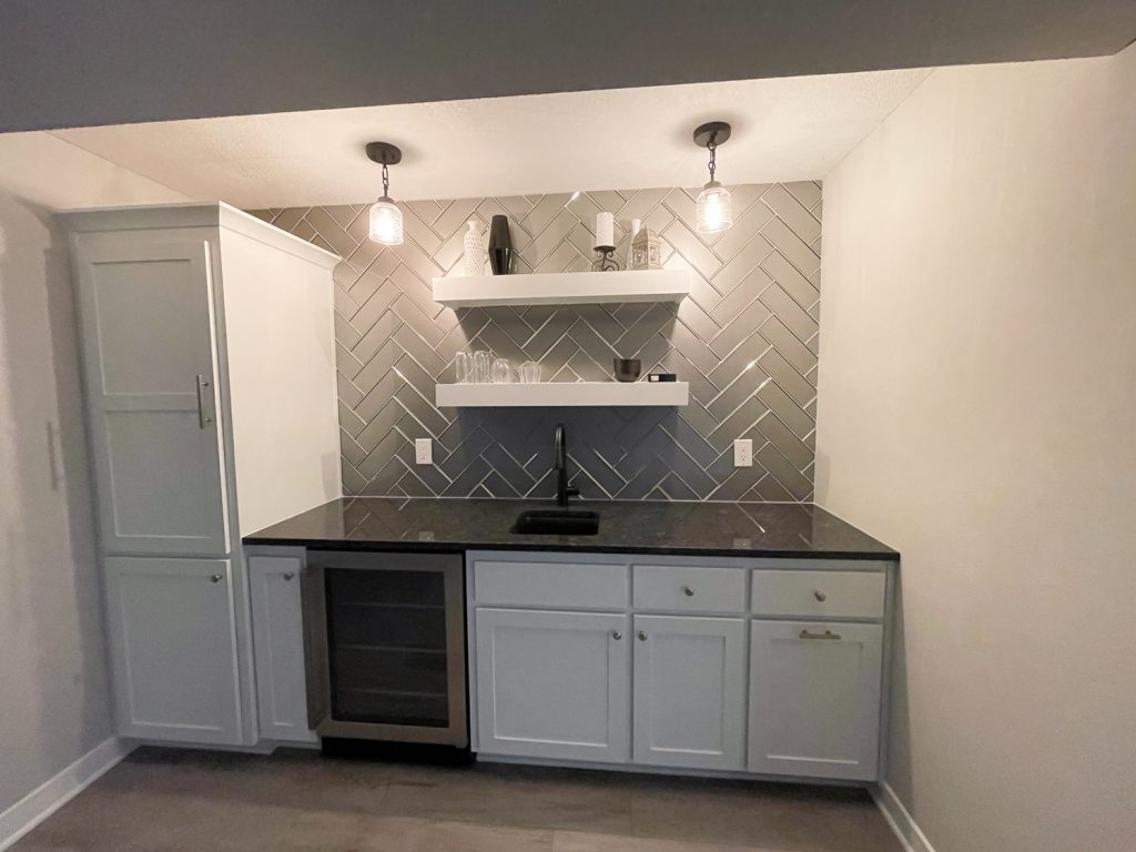 kansas city basement remodel wet bar with floating shelves